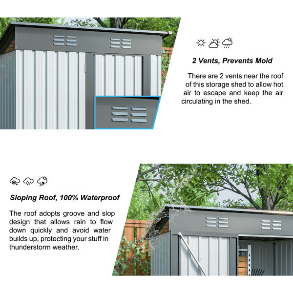 [Punched Vents]Unlike typical metal garden sheds with plastic vents, this shed comes with two integrated punched vents which will not deteriorate against sunlight.
