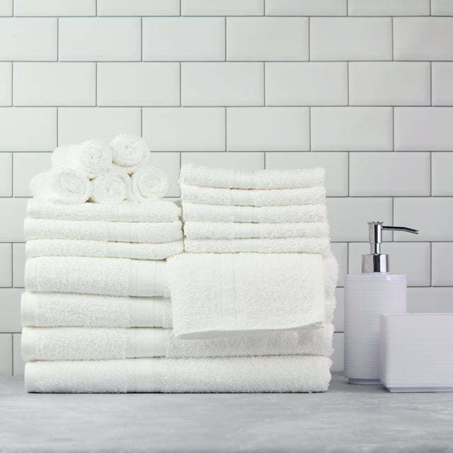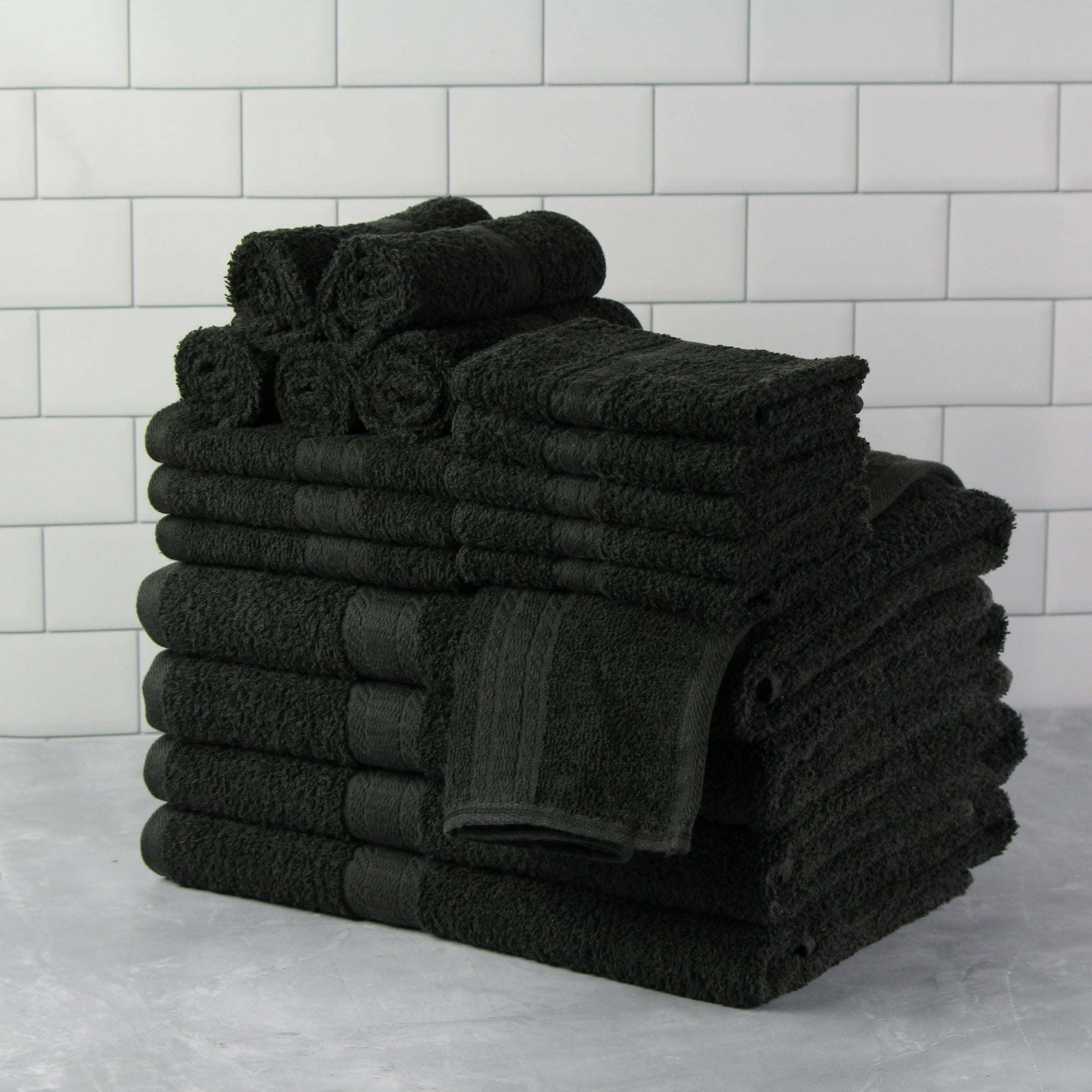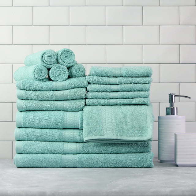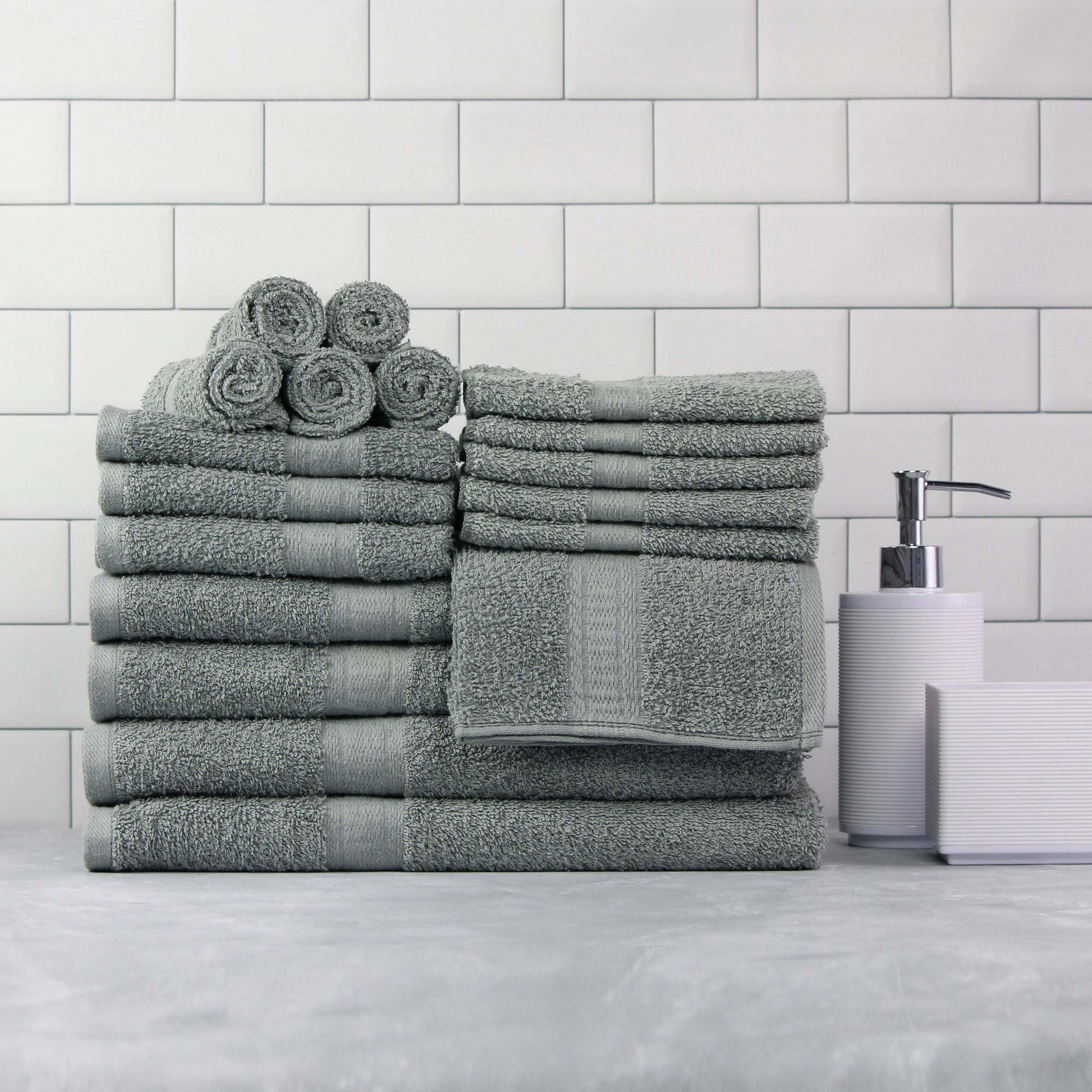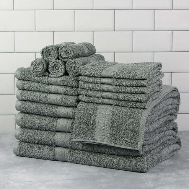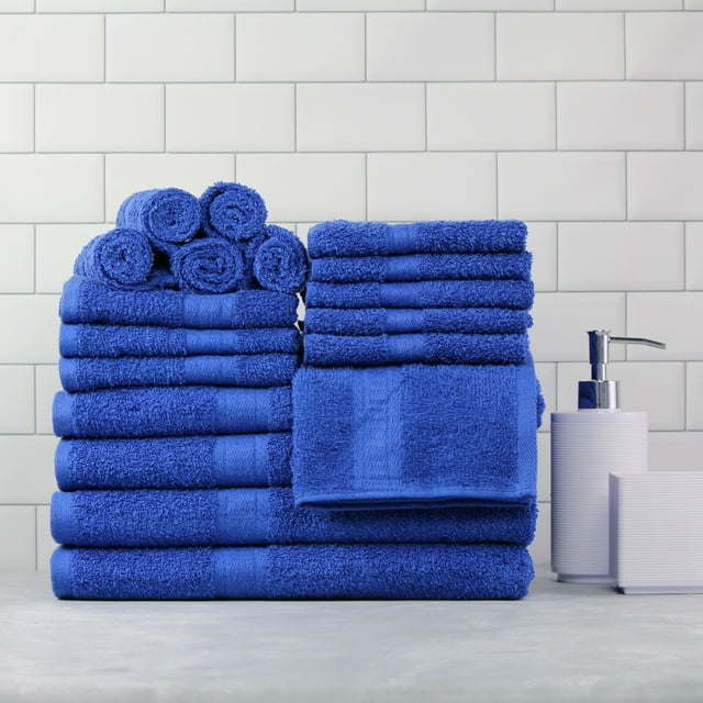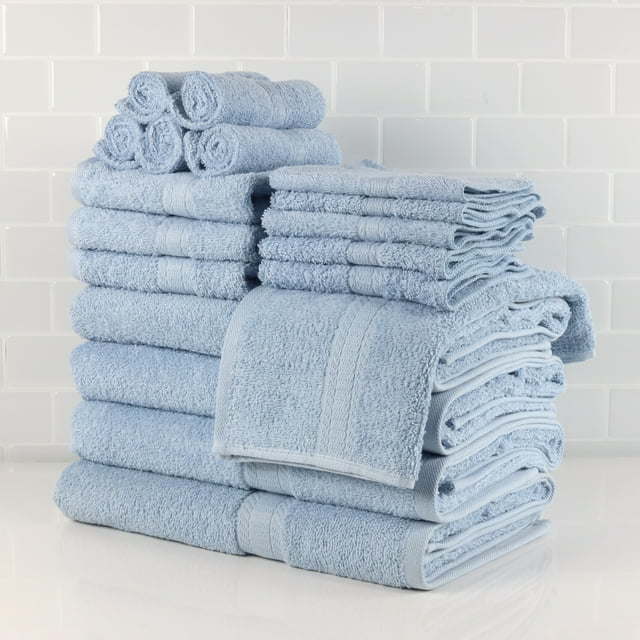 Refresh your linen closet with the durable yet incredibly soft and absorbent Basic Solid 18-piece bath set. Crafted using quality yarns these linens are easy care machine washable and ideal for everyday use. The Basic Solid 18-piece bath sets are 100% cotton and are available in several colors. Each set is Oeko-Tex Standard 100 certified and comes with (4) 27 in. by 52 in. bath towels, (4) 16 in. by 26 in. hand towels, and (10) 12 in. by 12 in. washcloths. Complete your collection with a coordinating stripe bath towel or mix and match your colors to create a different atmosphere and color pallet in your bathroom. Whichever look you prefer, the Basic Solid 18-piece bath set is sure to please.