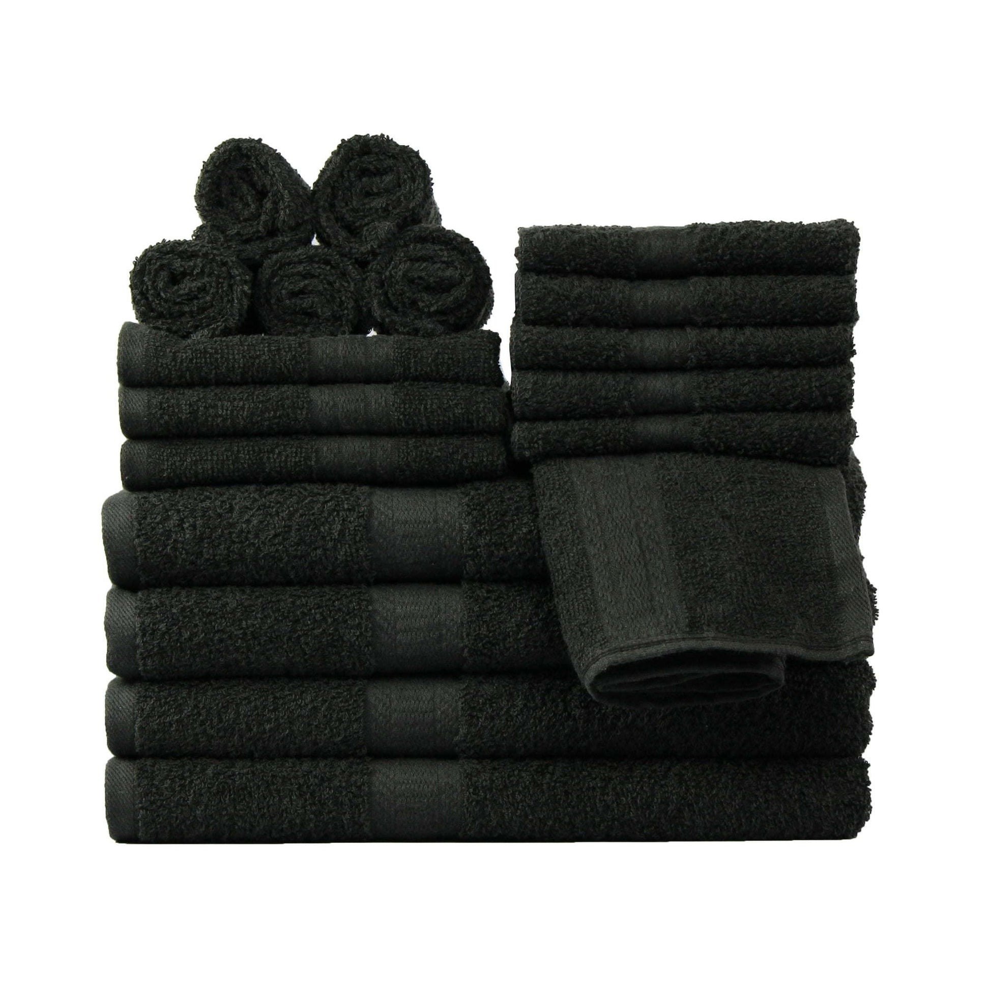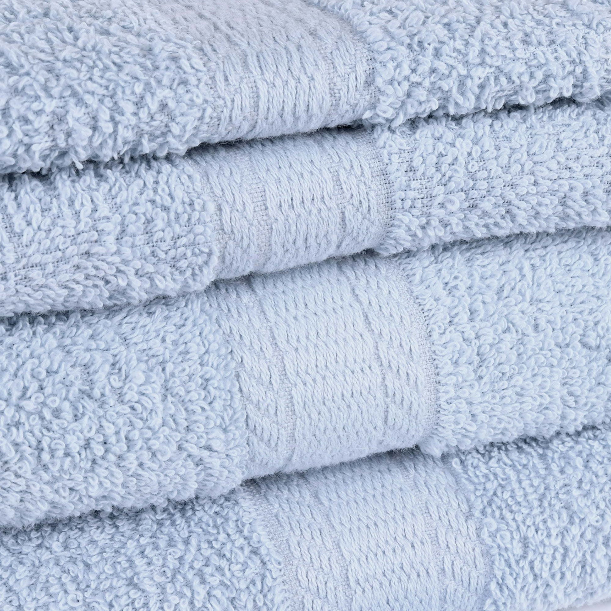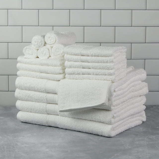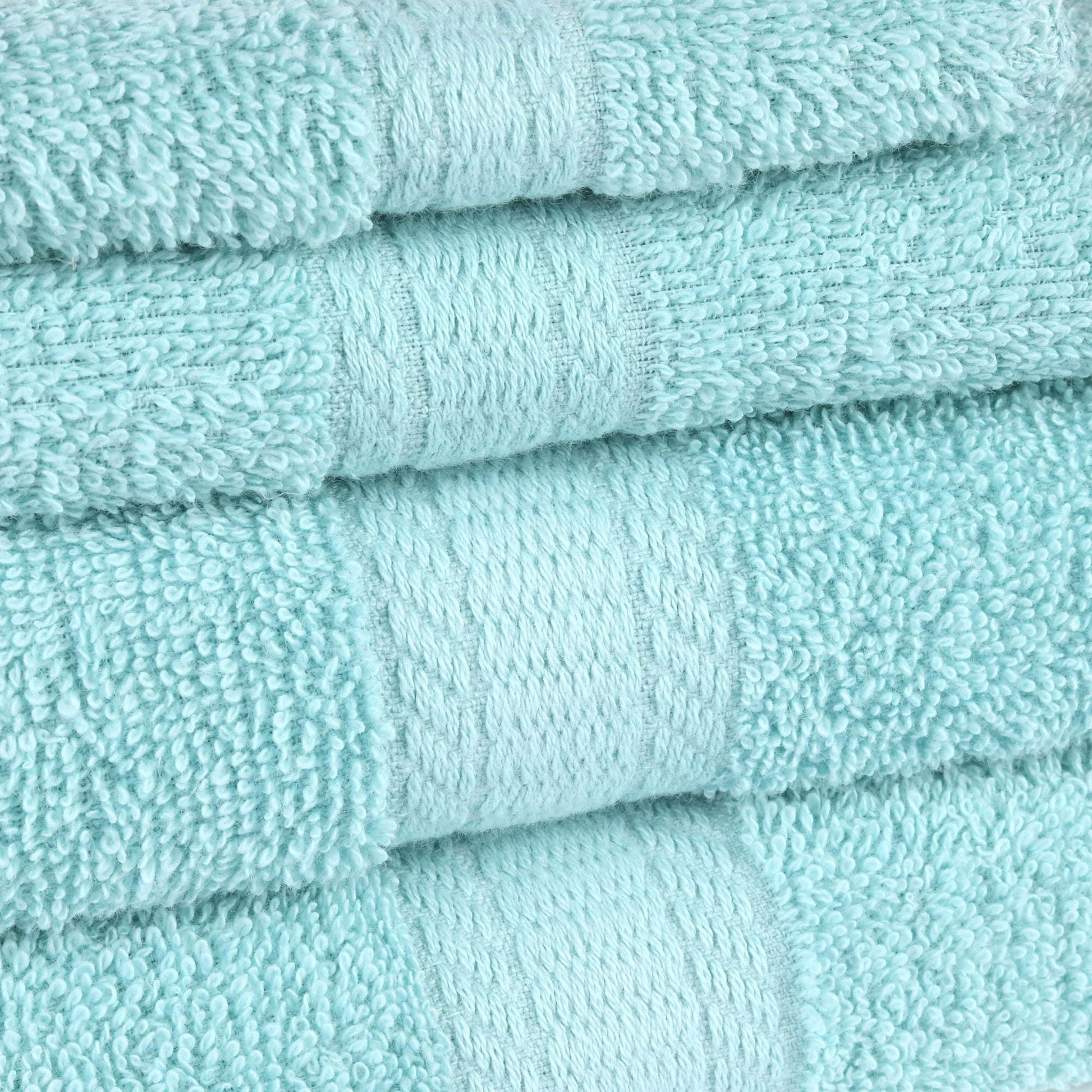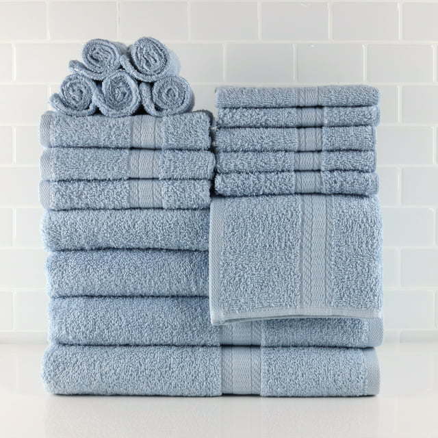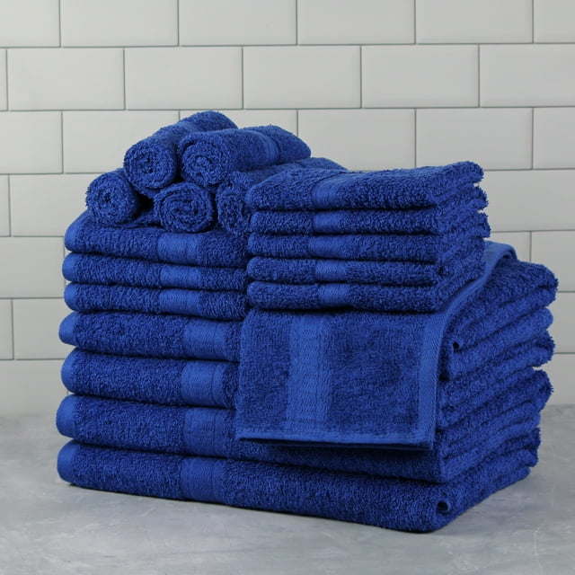 Refresh your linen closet with the durable yet incredibly soft and absorbent Basic Solid 18-piece bath set. Crafted using quality yarns these linens are easy care machine washable and ideal for everyday use. The Basic Solid 18-piece bath sets are 100% cotton and are available in several colors. Each set is Oeko-Tex Standard 100 certified and comes with (4) 27 in. by 52 in. bath towels, (4) 16 in. by 26 in. hand towels, and (10) 12 in. by 12 in. washcloths. Complete your collection with a coordinating stripe bath towel or mix and match your colors to create a different atmosphere and color pallet in your bathroom. Whichever look you prefer, the Basic Solid 18-piece bath set is sure to please.