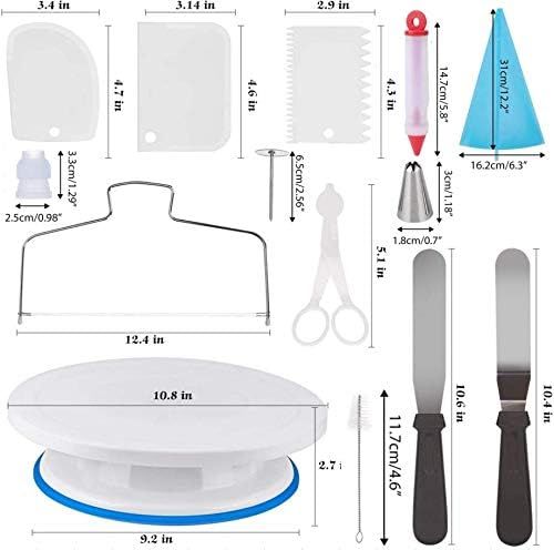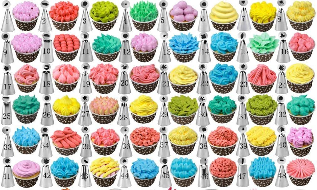 Package Includes: 1 Non-slip Cake Turntable 48 Stainless Icing Tip 3 Russian Piping Tips 2 Pastry Bag Tie 1 12inch Pastry Reusable Bags 1 Cake Decoration Pen 1 Cake Brush 1 Cake Cutter 1 Cake Pen 3 Cake Scrapers 2 cake nozzles small coupler 1 Tri Coupler 50 Disposable Icing Bag 1 Icing Spatula (27cm) 1 Angled Icing Spatula - (27cm ) 2 Flower Nail 1 Cake Flower Lifter 5 Measuring Spoon 1 Cake Smoother 1 Instruction And Ebook